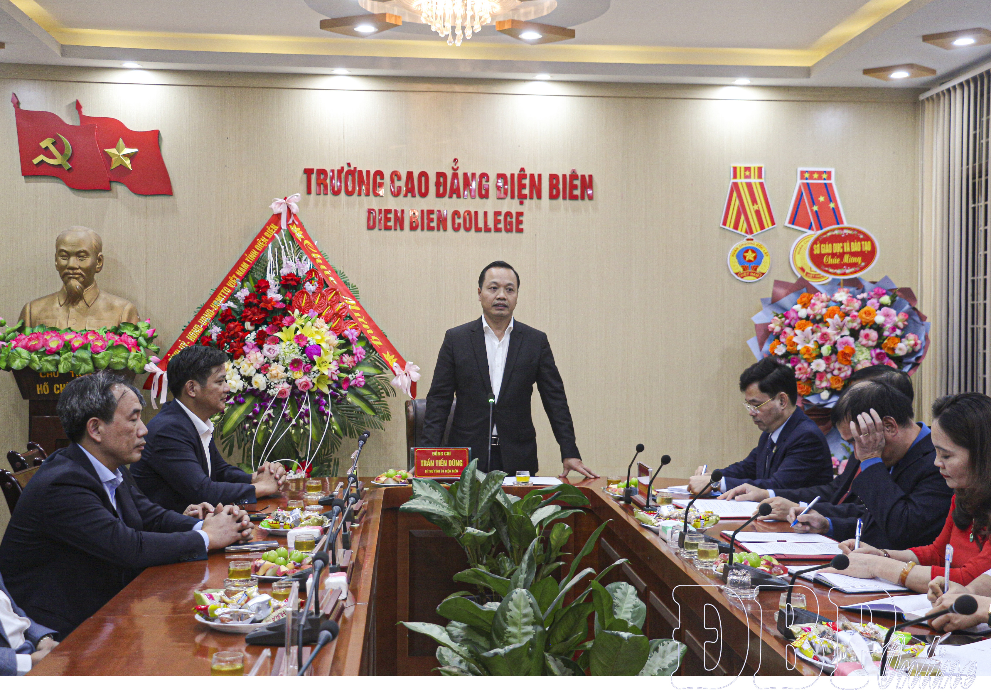 Bí thư Tỉnh ủy Trần Tiến Dũng chúc mừng Ban Giám hiệu, cán bộ, giảng viên nhà trường nhân ngày Nhà giáo Việt Nam. Đồng chí đánh giá cao những kết quả nổi bật Trường Cao đẳng Điện Biên đã đạt được; đồng thời nhấn mạnh: Trên cơ sở các ngành nghề và các khoa hiện có, nhà trường cần tiếp tục rà soát để xác định những ngành nghề trọng điểm phục vụ công tác đào tạo, bám sát nhu cầu của xã hội và doanh nghiệp cũng như các ngành nghề được đặt hàng. Nhà trường cũng cần chú trọng hơn đến việc dạy tiếng Nhật, tiếng Trung Quốc cho học sinh, sinh viên cũng như đội ngũ cán bộ giáo viên, công chức của trường. Đội ngũ thầy cô phải thường xuyên trau dồi kiến thức, nâng cao trình độ chuyên môn, tay nghề; tăng cường phối hợp với các doanh nghiệp để đưa học sinh, sinh viên đi thực tế. Cùng với đó, nhà trường cần xác định rõ những nội dung sẽ tham gia cùng tỉnh trong triển khai thực hiện Nghị quyết 57 về đột phá phát triển khoa học, công nghệ, đổi mới sáng tạo và chuyển đổi số Quốc gia. Bí thư Tỉnh ủy gợi mở nhà trường có thể chú trọng đẩy mạnh nghiên cứu khoa học; thành lập Trung tâm đổi mới sáng tạo, từ đó, góp phần đáp ứng yêu cầu phát triển của tỉnh.