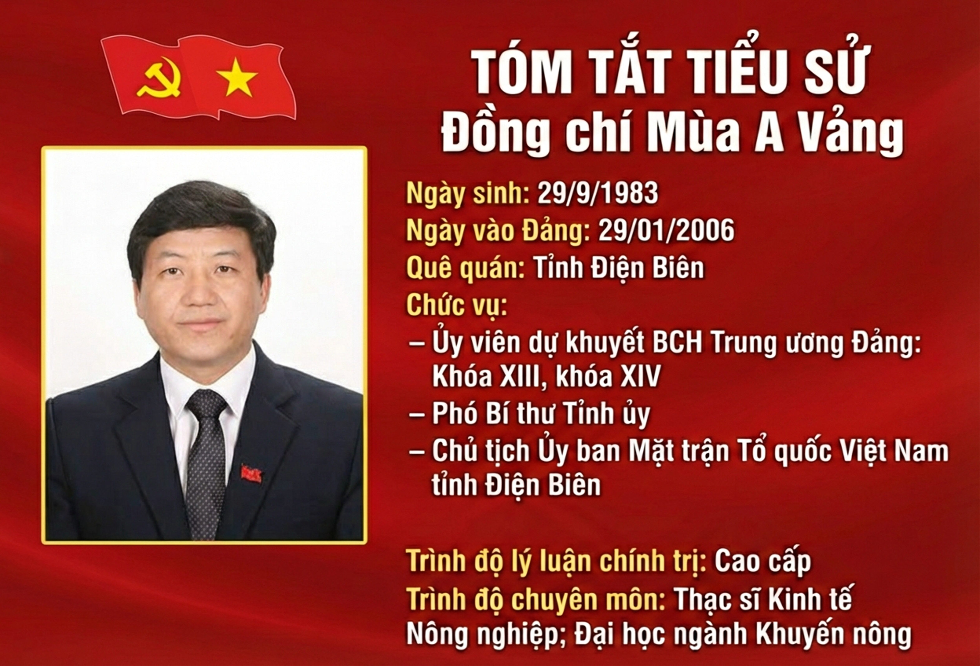 Chiều ngày 22/1, Đại hội đại biểu toàn quốc lần thứ XIV của Đảng tiến hành ghi phiếu, bỏ phiếu, công bố kết quả và thông qua danh sách các đồng chí trúng cử vào Ban Chấp hành Trung ương Đảng khóa XIV. Đồng chí Mùa A Vảng, Ủy viên (dự khuyết) Trung ương Đảng khóa XIII, Phó Bí thư Tỉnh ủy, Chủ tịch Ủy ban MTTQ tỉnh đã trúng cử Ủy viên (dự khuyết) Ban Chấp hành Trung ương Đảng khóa XIV. Báo và phát thanh, truyền hình Điện Biên trân trọng giới thiệu tóm tắt tiểu sử đồng chí Mùa A Vảng.