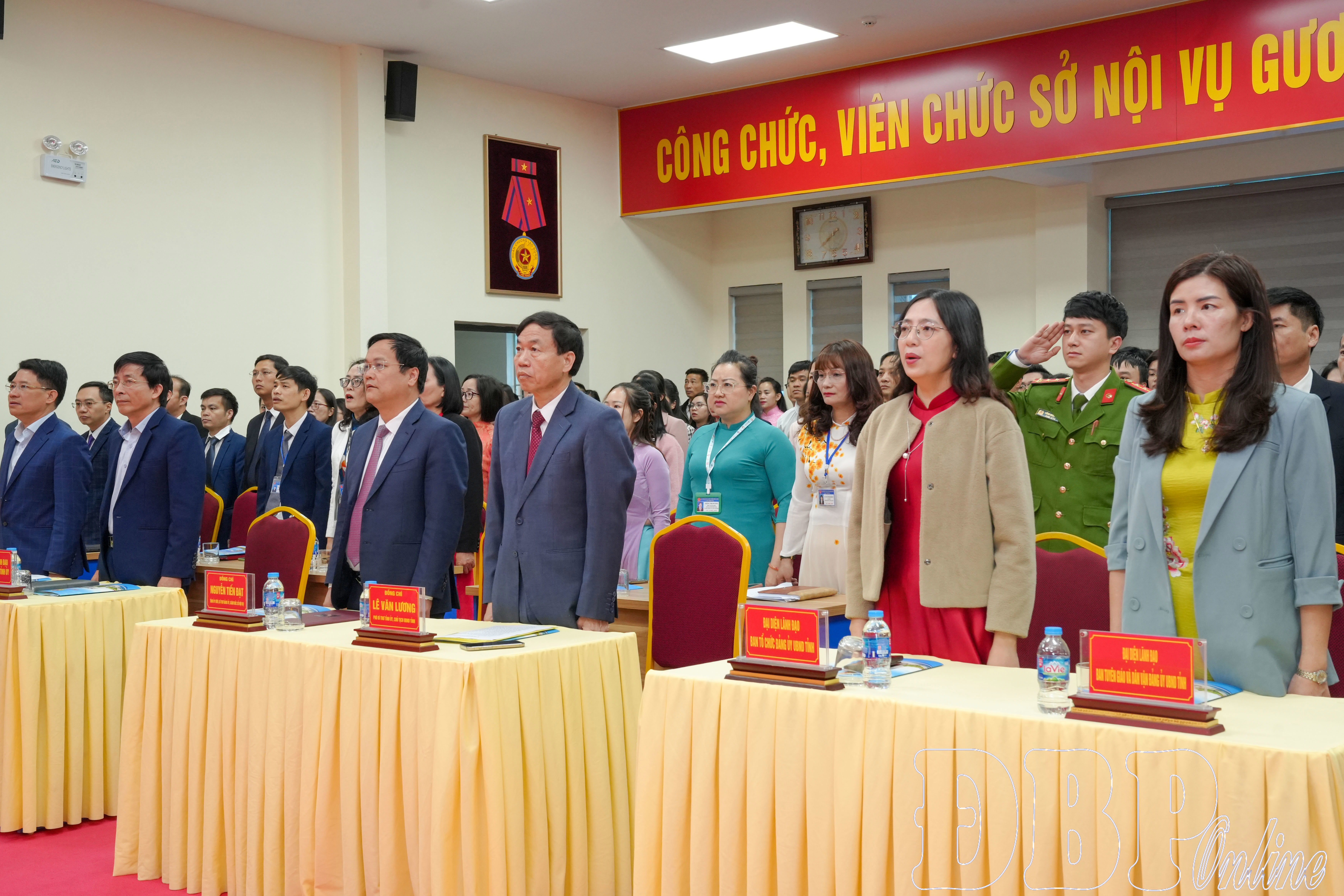 Đại biểu, cán bộ, đảng viên, công chức, viên chức Sở Nội vụ thực hiện nghi lễ chào cờ.