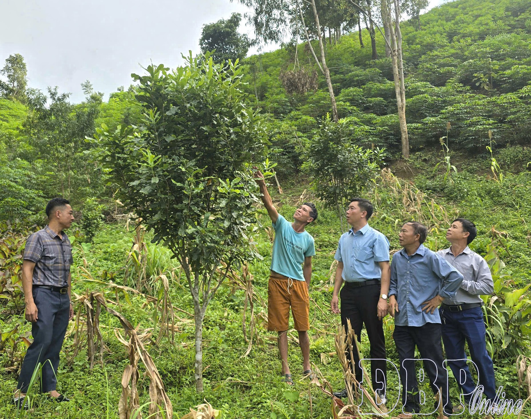 Lãnh đạo xã Sáng Nhè kiểm tra mô hình trồng cây mắc ca tại thôn Pá Ỏ.