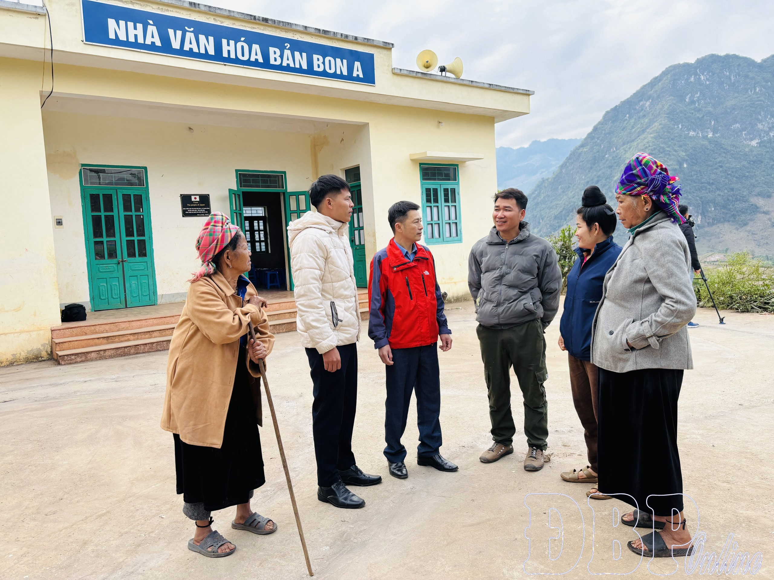 Ông Phạm Trọng An, Phó Giám đốc Trung tâm Dịch vụ tổng hợp xã Pú Nhung (thứ 4 từ phải sang) trao đổi, nắm bắt tình hình sản xuất và đời sống nhân dân tại bản Bon A.