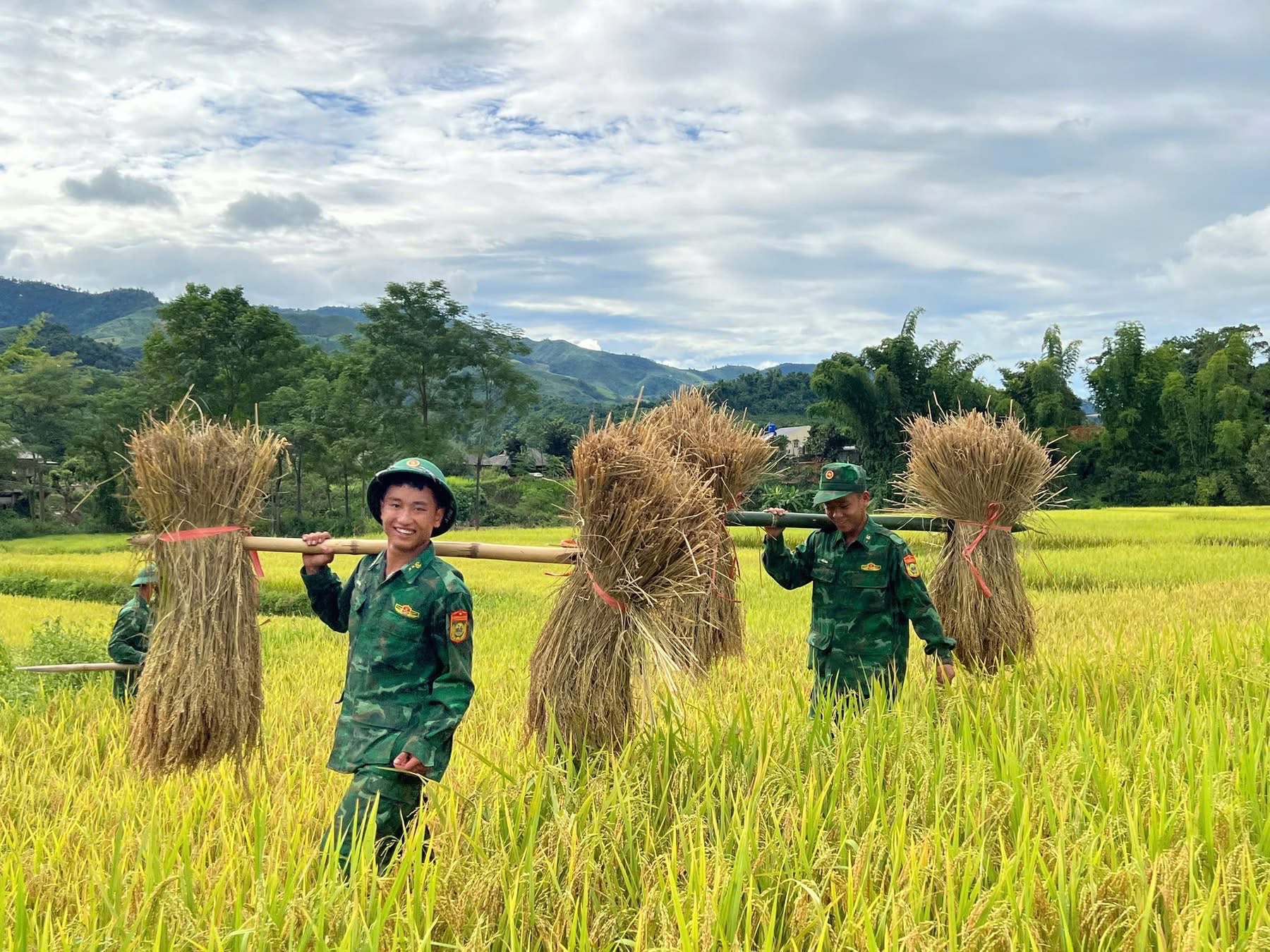 Cán bộ, chiến sĩ Đồn Biên phòng Mường Nhà giúp nhân dân thu hoạch lúa mùa, góp phần thắt chặt tình quân - dân nơi biên giới.