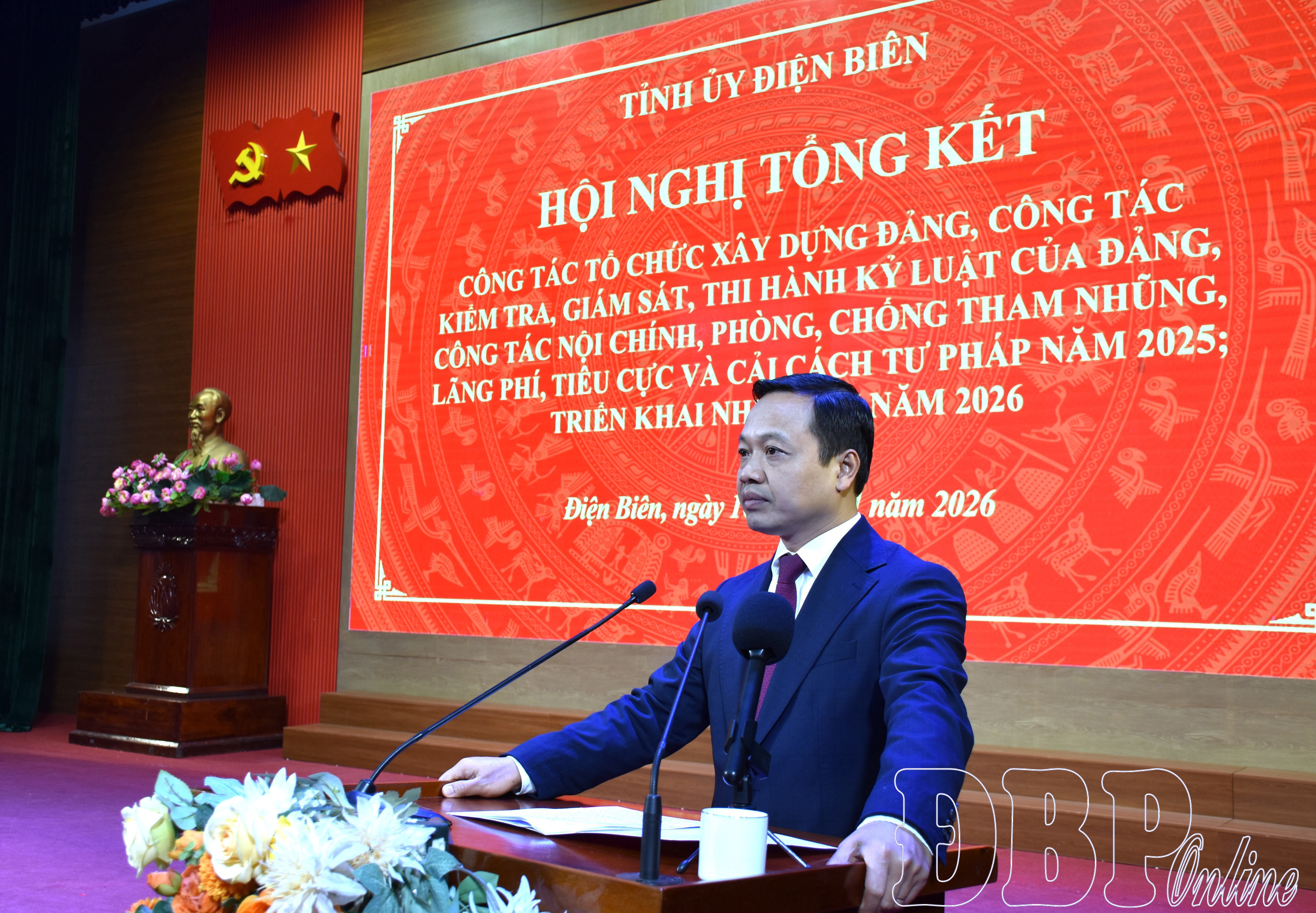 Bí thư Tỉnh ủy Trần Tiến Dũng đánh giá cao nỗ lực của các cấp ủy, tổ chức đảng, ủy ban kiểm tra các cấp, các cơ quan, đơn vị. Nhấn mạnh năm 2026 là năm diễn ra nhiều sự kiện chính trị quan trọng của đất nước và của tỉnh, Bí thư Tỉnh ủy đề nghị các cấp ủy, tổ chức đảng, ủy ban kiểm tra tiếp tục tập trung chỉ đạo cụ thể hóa, tổ chức thực hiện hiệu quả Nghị quyết Đại hội XIV của Đảng, Nghị quyết Đại hội Đảng bộ tỉnh lần thứ XV; tổ chức thành công cuộc bầu cử đại biểu Quốc hội khóa XVI và đại biểu Hội đồng nhân dân các cấp nhiệm kỳ 2026 - 2031 trên địa bàn. Tiếp tục quan tâm chỉ đạo vận hành tổ chức bộ máy của hệ thống chính trị theo mô hình mới bảo đảm thông suốt, đồng bộ, đáp ứng yêu cầu nhiệm vụ phát triển đất nước và địa phương trong giai đoạn mới; rà soát, hoàn thiện các quy định, quy chế, hướng dẫn; nâng cao hiệu quả công tác kiểm tra, giám sát, thi hành kỷ luật của Đảng, phòng, chống tham nhũng, lãng phí, tiêu cực, cải cách tư pháp...