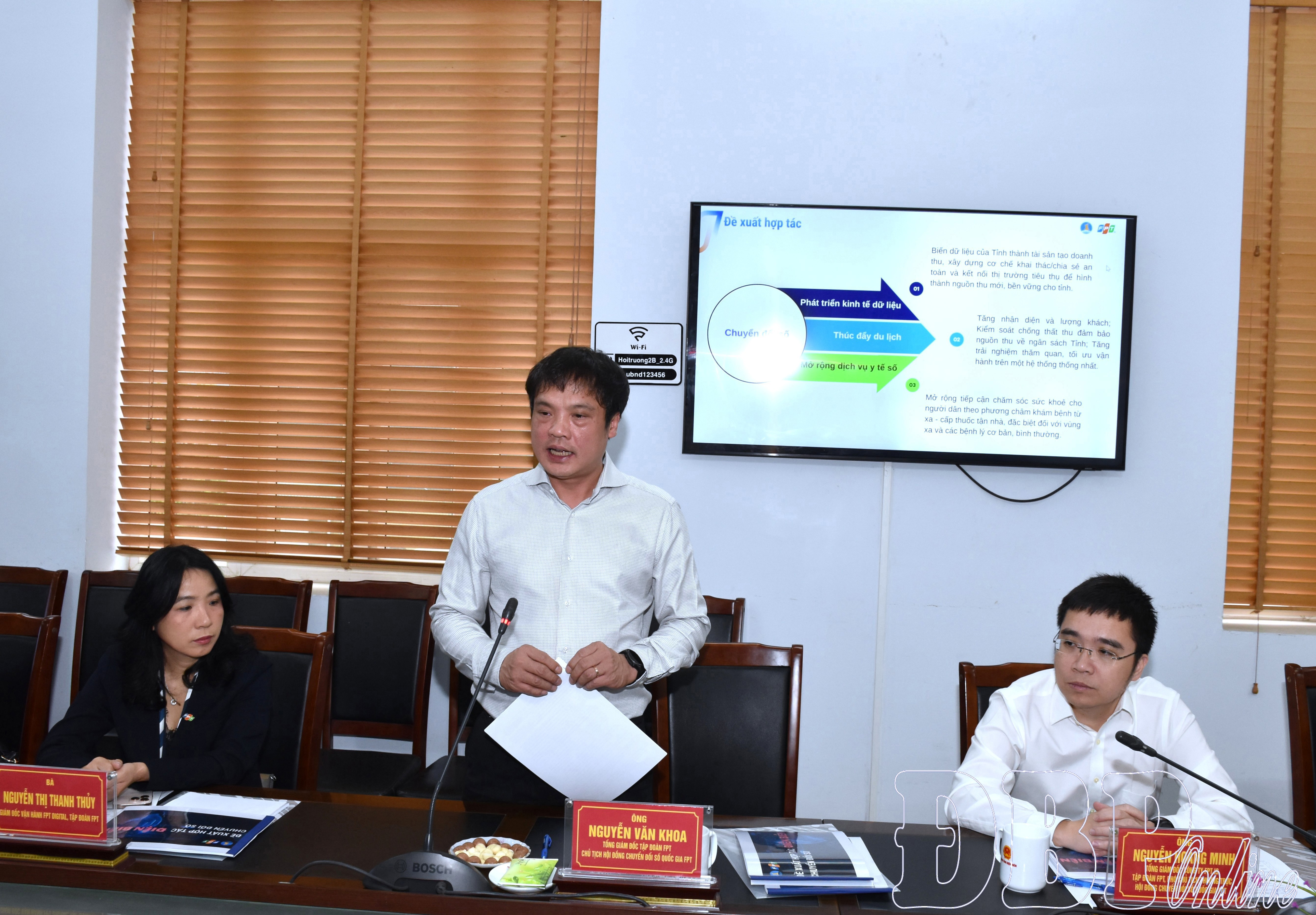 Ông Nguyễn Văn Khoa, Tổng Giám đốc Tập đoàn, Chủ tịch Hội đồng Chuyển đổi số quốc gia FPT trao đổi, đề xuất các nội dung liên quan tại buổi làm việc với UBND tỉnh Điện Biên.