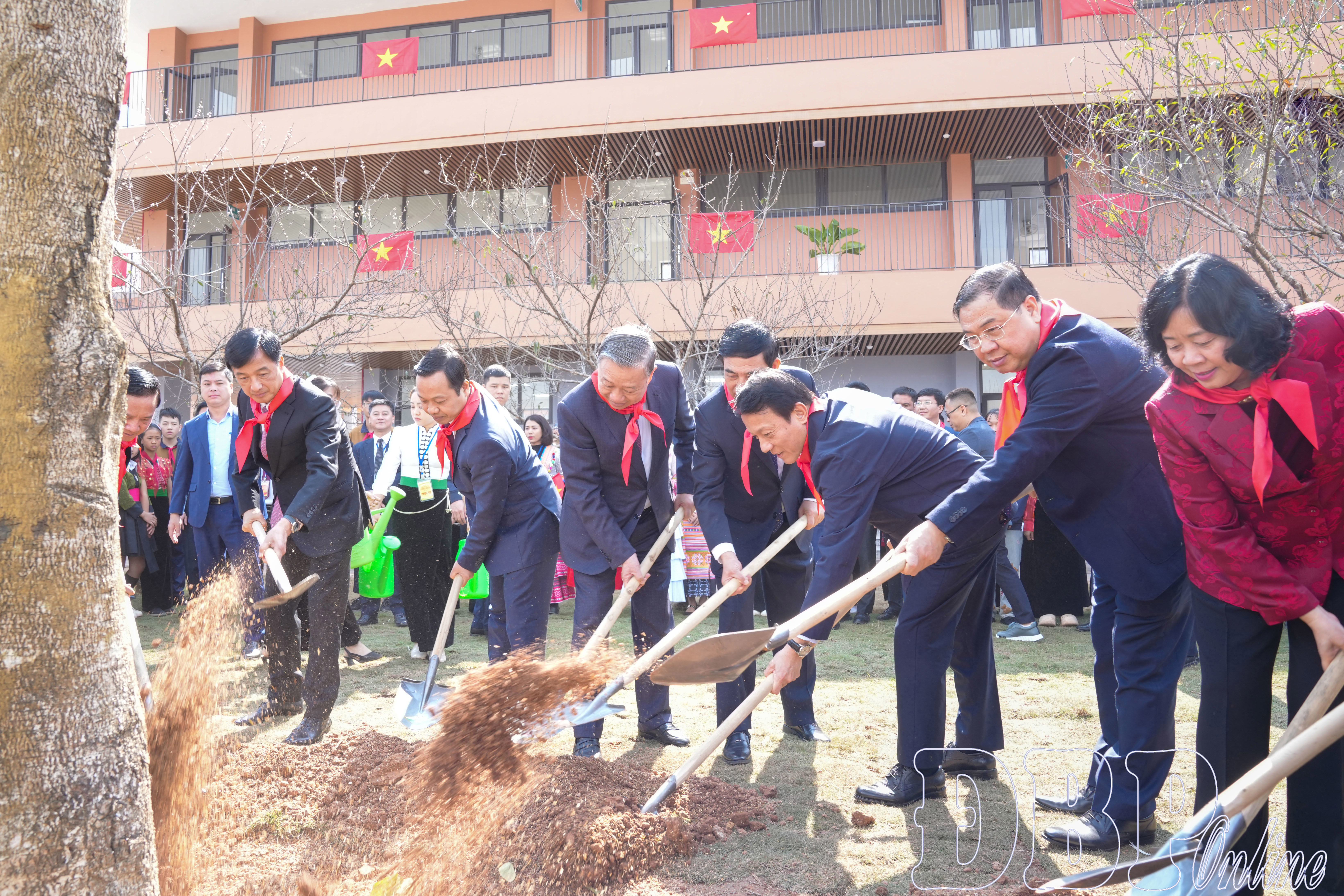 Tổng Bí thư Tô Lâm và các đồng chí lãnh đạo Đảng, Nhà nước, tỉnh Điện Biên trồng cây lưu niệm tại Trường Phổ thông nội trú liên cấp Tiểu học - THCS Si Pa Phìn.